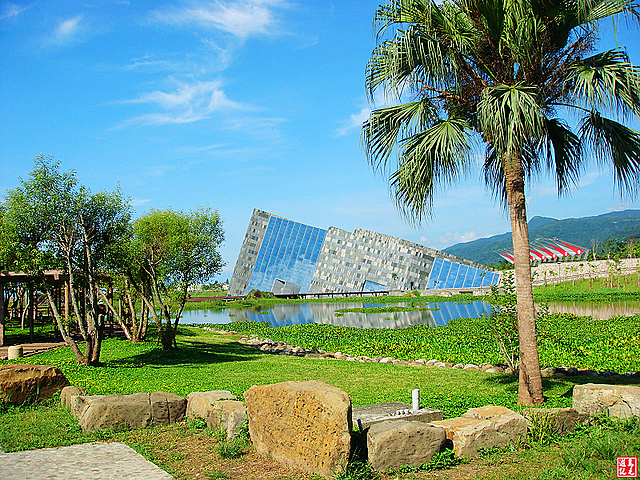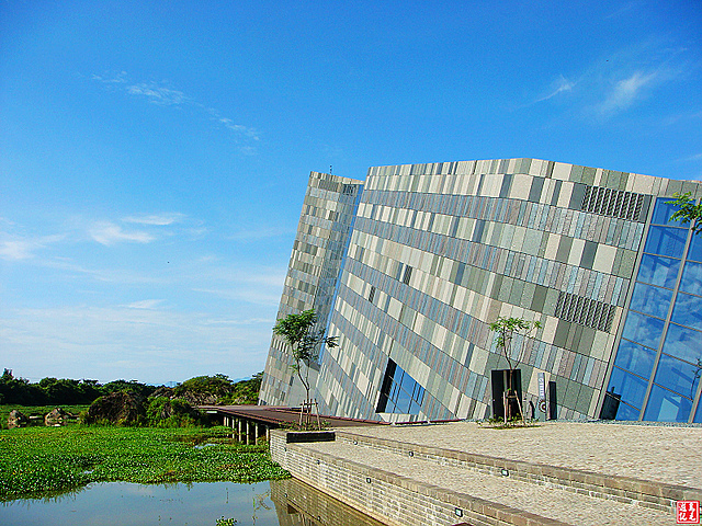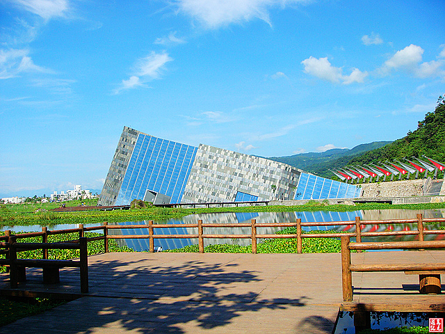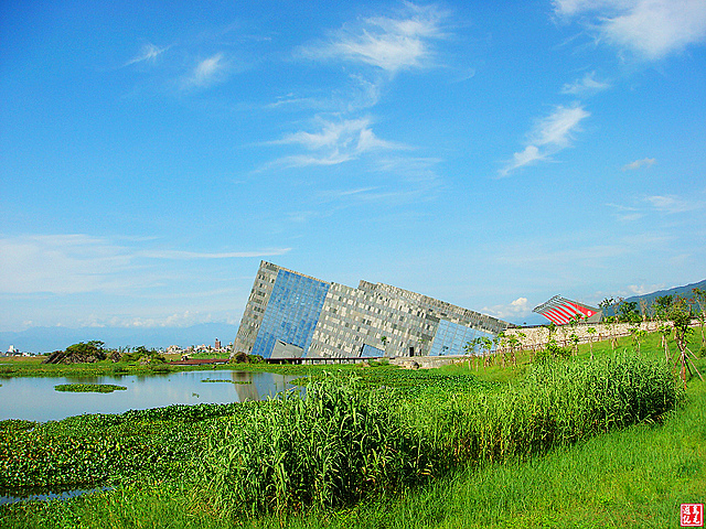 站在溼地一旁,端詳這顛覆一般建築設計的蘭陽博物館,左高右低傾斜造型,左右與水平面夾角各約60度、30度,就像一棟長方形的大樓,另一半被隱入地面般的感覺。