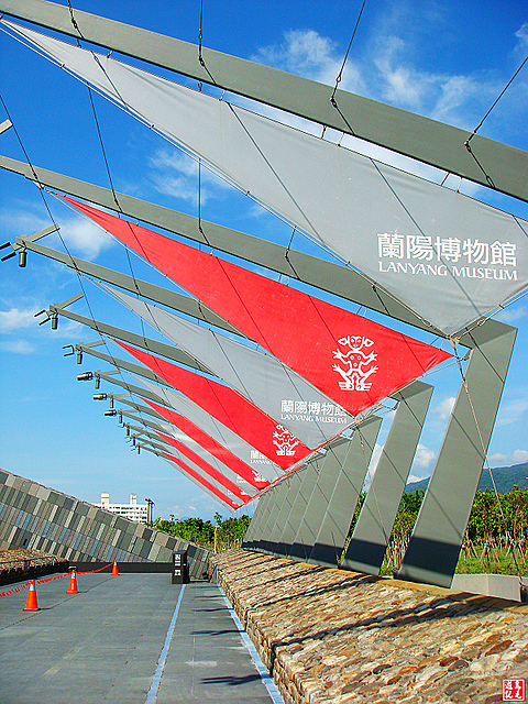 蘭博館正門前的迎賓大道,一整排旗幟造型,紅、灰色相互間隔,營造出立體與層次,遠近之間的幾何線條,構造出蘭陽八景之一的「石港春帆」御風遠颺意象。