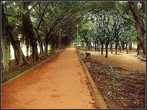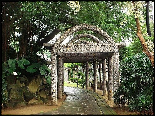 進入公園後,首先看到是圓形花台,下雨天倒顯得有點冷清。一旁有一石穴小隧道,感覺別有洞天,進入瞧瞧。