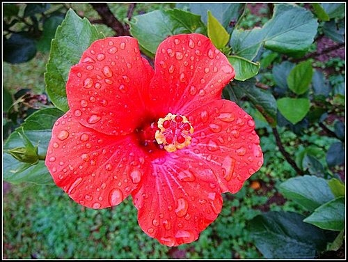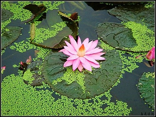 步入至德園趨近蓮荷池畔,時值嚴寒冷冬,池中的王蓮與池畔的紅花,柔弱的身軀,在風雨中竟顯出幾分憔悴。