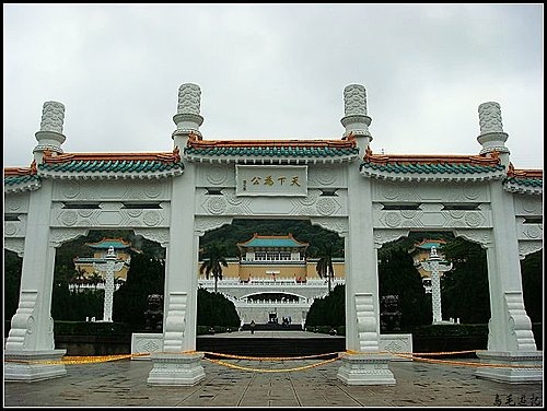 出至德園續行至善路二段到達故宮博物院,館前牌樓上有國父題字「天下為公」。