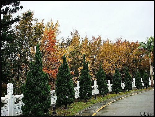 環繞路邊的翠綠小青松,背景襯托著至善園內金黃色的楓香樹,在雨中洗滌得更為亮眼出色,稍後搭乘紅30路客運回捷運士林站。