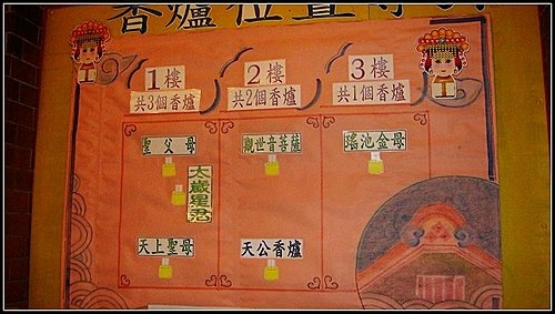 拱天宮歷史悠久香火鼎盛,香爐共有6處,1樓供奉太歲星君、聖父母、天上聖母,2樓供奉天公香爐、觀世音菩薩,3樓則為瑤池金母,善男信女皆虔誠膜拜。