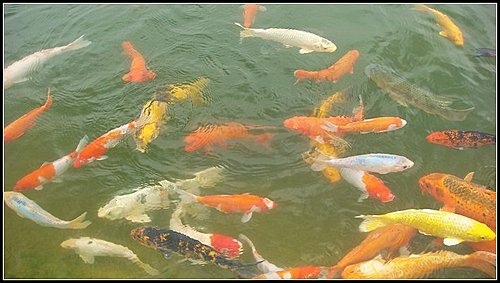 鯉魚池內色彩鮮豔的錦鯉爭相搶食