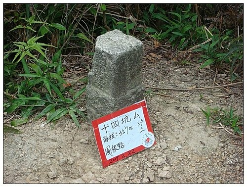 約15分鐘抵十四坑山,有土地調查局圖根點基石,海拔357公尺,比起新山海拔499公尺矮了許多。