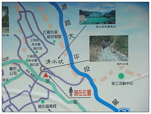 龍潭鄉的清水坑至今仍存有客家農村景觀之美,至此遊賞之餘除了品嘗客家美食、石門活魚,最讓人印象深刻的便是土角厝、田園景觀,另外值得一提的是打牛崎古道(別名:趕牛古道),為昔日清朝官道遺址,古色古香,林蔭竹茂,景觀天成,已成為遊客最愛,此外清水坑自行車步道沿途風光明媚,正如陶淵明所述,有良田、美池、桑、竹之屬,東西一舍,阡陌交通,雞犬相聞,充滿農村特色。