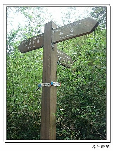到達第一個鞍部,稍作休息,此處有叉路,直行是往楊厝,往左是獅子嘴奇岩,依指標上所記里程1.5K需時50分鐘,則去回也要100分鐘,今日不取擇日再訪吧。過鞍部後續前行變成下坡路,一路上感覺就是上上下下,至少爬過5.6個鞍部。