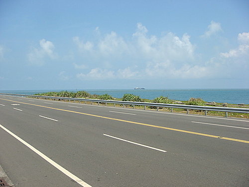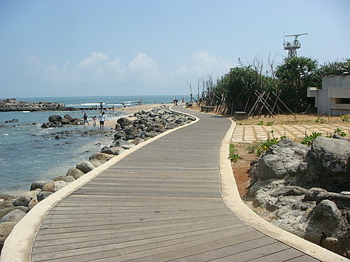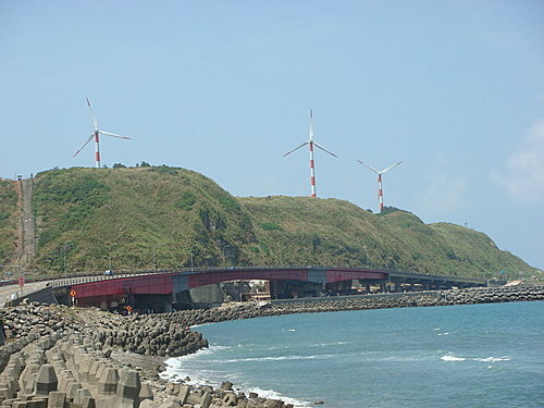 看完石門洞續沿著台2線行走,可抵達一座跨越海邊的嶄新紅橋-王公橋,這是公路沿線最美麗的景觀橋樑,在這座新橋內側的舊路旁,是北海岸香火最鼎盛的舊十八公廟。山後可見巨大的石門風力發電風車。