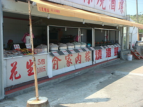 石門一帶公路一側攤販林立,販售當地名產肉粽、燒酒螺。