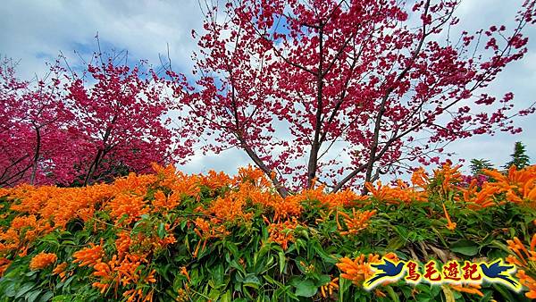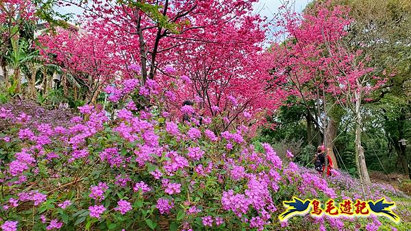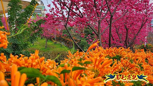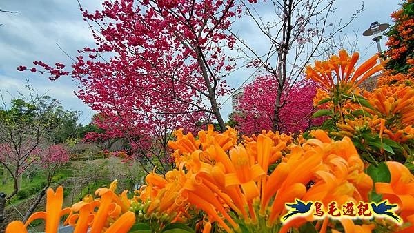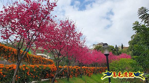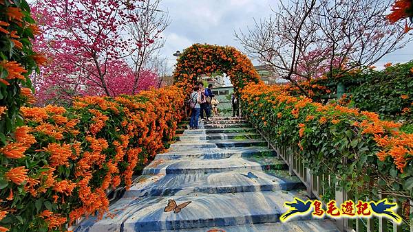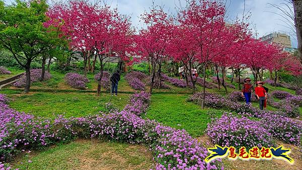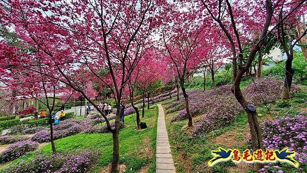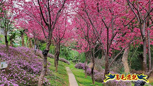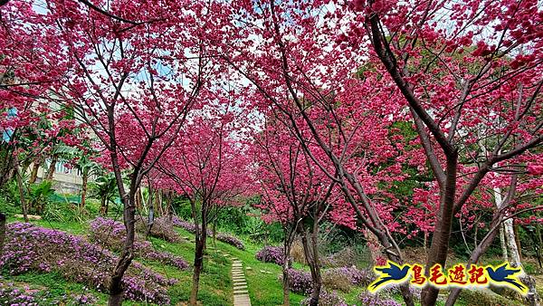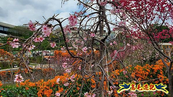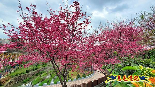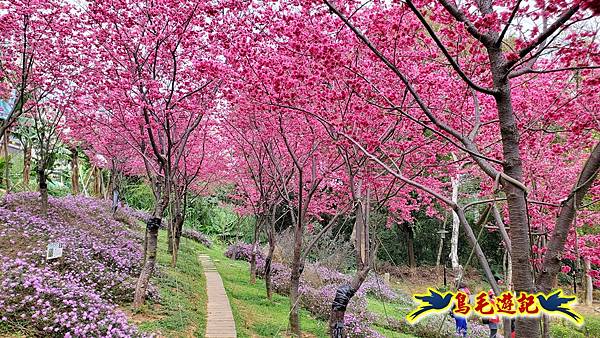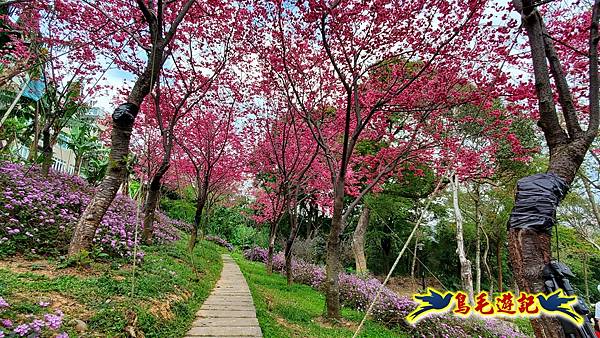 雖然只是一小片櫻花林,貼心施作櫻花小步道供遊客取景拍照,且附設有可愛大小熊貓、炮仗花涼亭及遊樂設施,