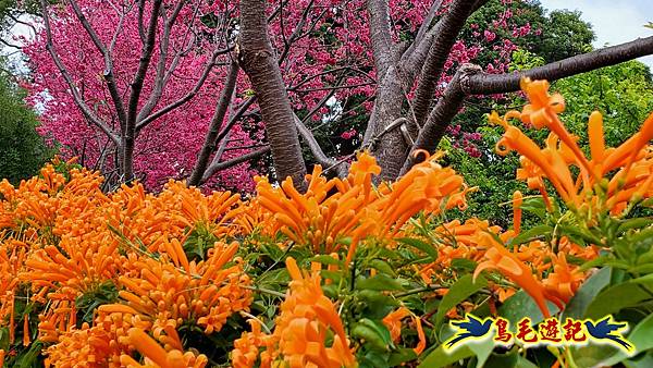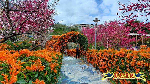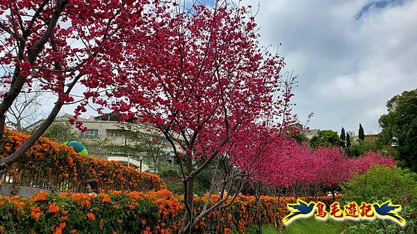 公園內炮仗花、櫻花美不勝收,還有可愛造型的動物及人偶雕塑,可以增進親子同遊的樂趣,