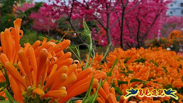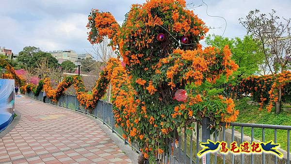 鶯歌永吉公園櫻花炮仗花賞心悅目,園內也有立體3D彩繪及兒童玩偶造型雕塑,今年是龍年特地打造應景的龍形炮仗花牆,
