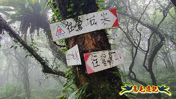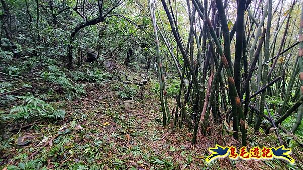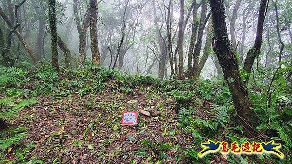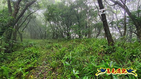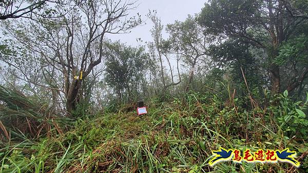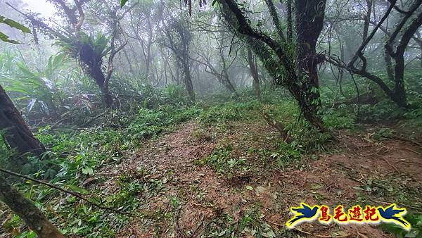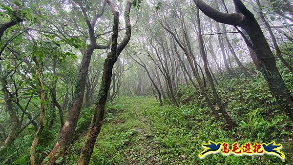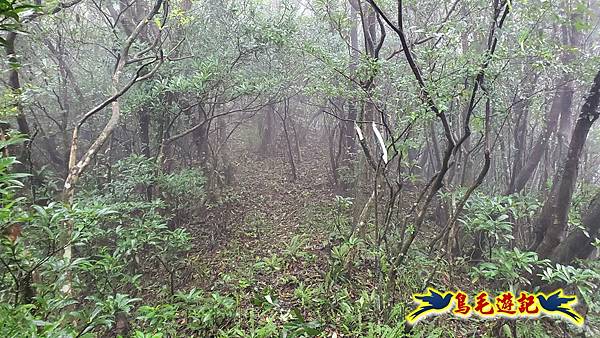 七兄弟山(525峰)稍歇,續前行,陰雨綿綿風勢強勁,過雜樹林後拉繩陡上芒草區無名山頭,再下切至林中三叉路,