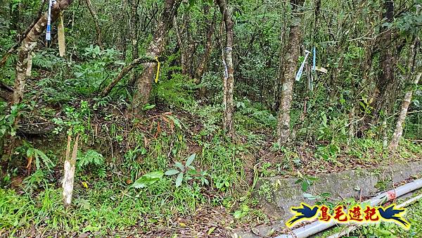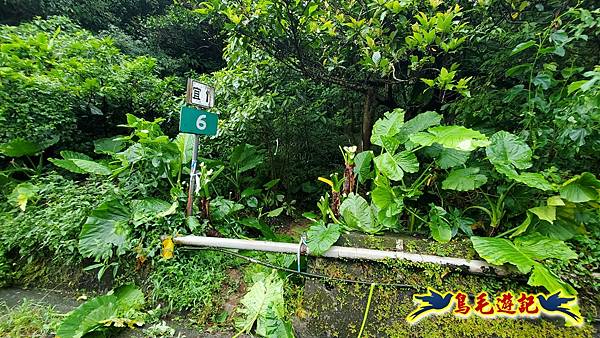 明山寺不遠處有宜1鄉道6K里程標,就是往鷹石尖新闢登山口,跨越大水管後穿過綠竹區,漸緩上坡,遍地是颱風吹落樹枝樹葉,