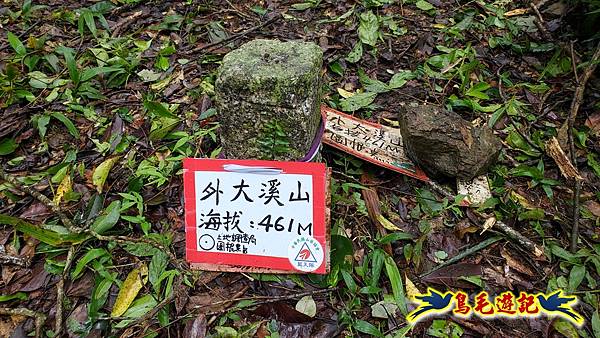 接下來大致都是下坡路,約14分至外大溪山,海拔461公尺,有土調局圖根點基石,