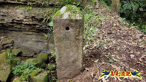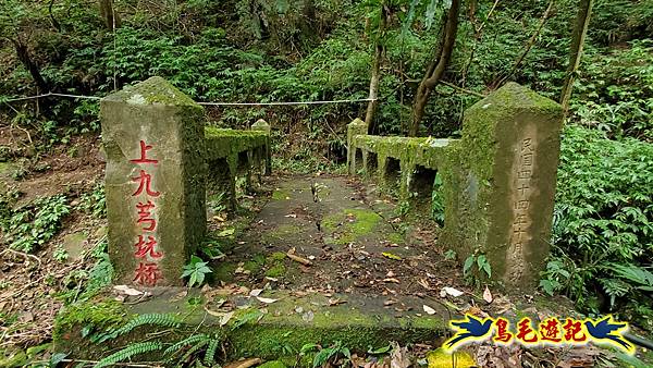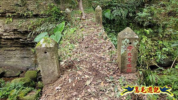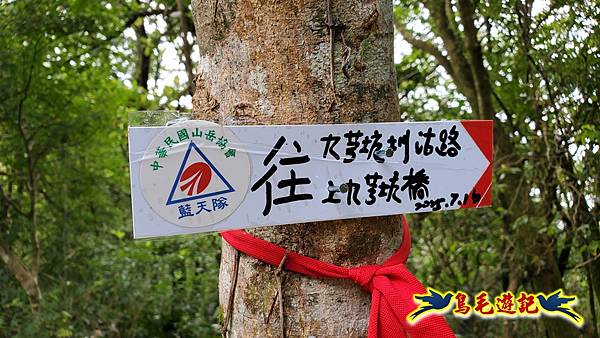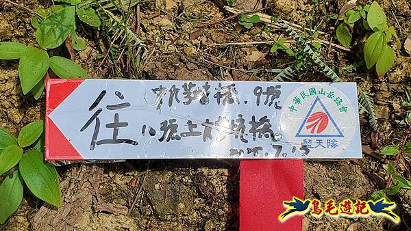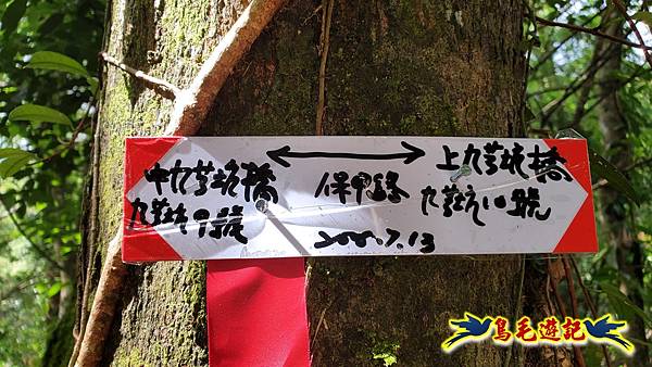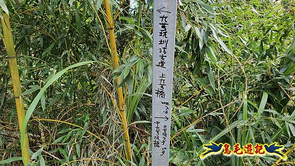 9:18緩上坡途中右側鐵網圍籬缺口,角鐵柱上有藍天隊江隊長娟秀字跡:←九芎坑圳沽古道 上九芎坑橋 /中九芎坑橋→