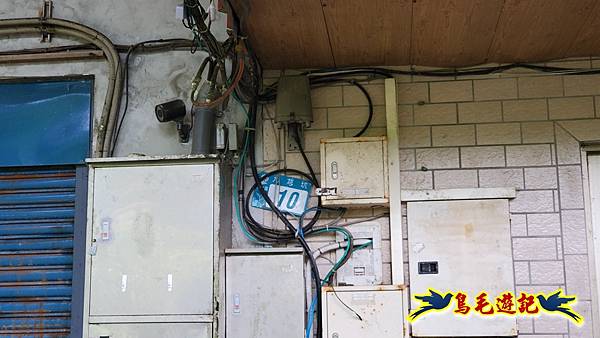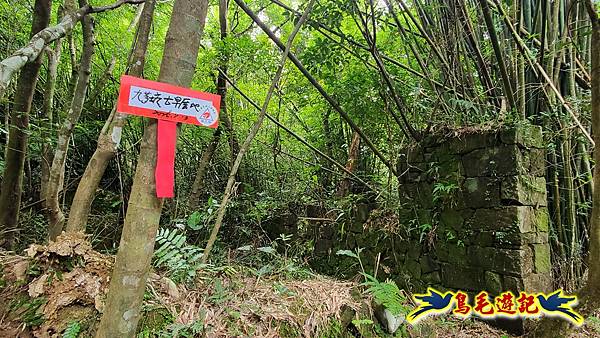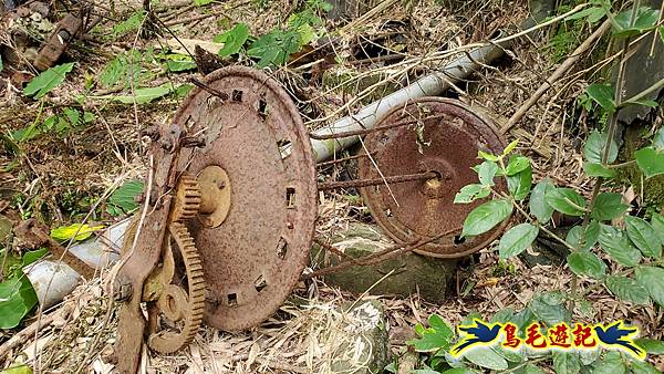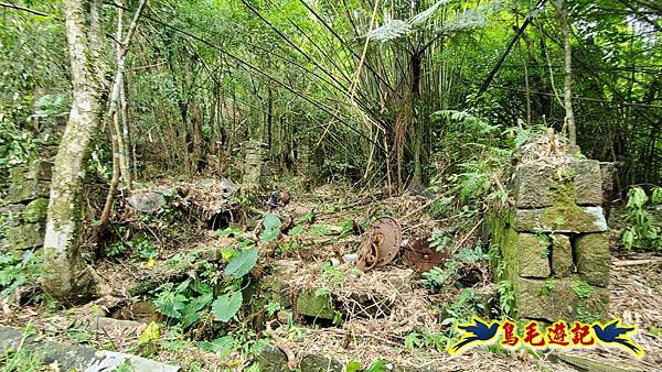 9:04九芎坑古早厝地,四周高大竹欉圍繞,石頭厝內有舊時機械殘骸,