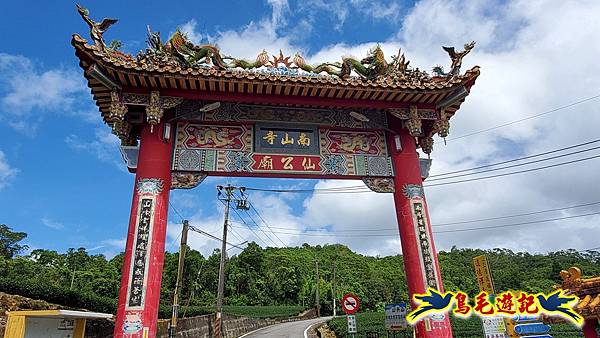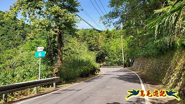 沿途欣賞山坡茶園,還有小花紫葳,10:02從南山寺牌樓下來接北42鄉道(坪雙路),續取右,10:03經北42/6.5K叉路直行緩下,