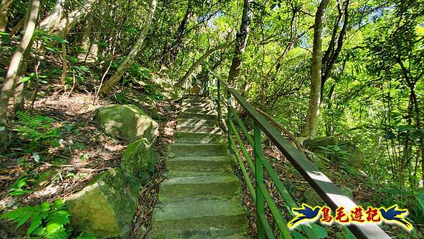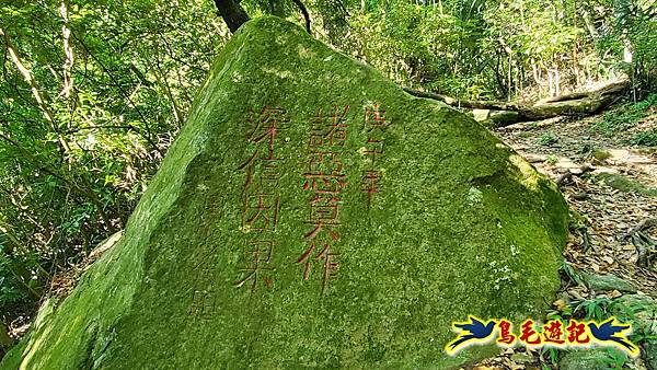 一路陡上的石階,讓人爬得汗水狂流,途中有石碑刻字:諸惡莫作深信因果,約10分爬到上方步道口,