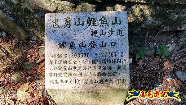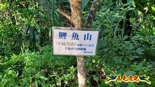 鯉魚山步道最高點就是鯉魚山所在,建有一座水泥涼亭,旁有土地調查局圖根點基石,又稱小坑尖山,海拔高度222公尺,