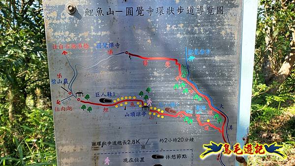依步道導覽圖示,鯉魚山-圓覺寺環狀步道路線串連大溝溪步道-圓覺寺步道-鯉魚山步道,總長2.8K/約2小時20分,