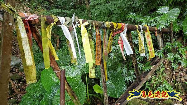 10:01豹子廚古道登山口從9號民宅的右側進入,過水泥橋,階梯步道入口處繫滿登山條。